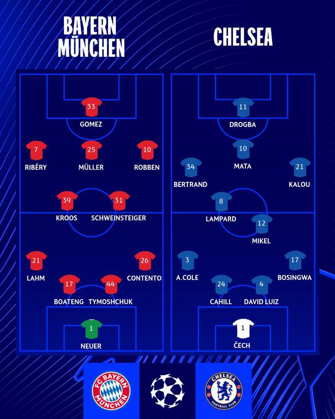 本场比赛常规时间最后时刻,德罗巴利用切尔西全场唯一角球头球破门,帮助蓝军1-1扳平比分,将比赛拖入加时。加时赛中,罗本射失点球,最终两队进入点球大战。点球大战切尔西4-3,总比分5-4击败拜仁,夺得队史首座欧冠冠军奖杯。