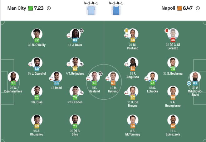曼城(433):26-多纳鲁马;45-胡桑诺夫,3-迪亚斯,24-格瓦迪奥尔(80’6-阿克),33-奥莱利;16-罗德里(60’14-尼科);20-B席,47-福登,4-赖因德斯(80’82-刘易斯),10-多库(69’26-萨维尼奥);9-哈兰德(80’52-鲍勃)