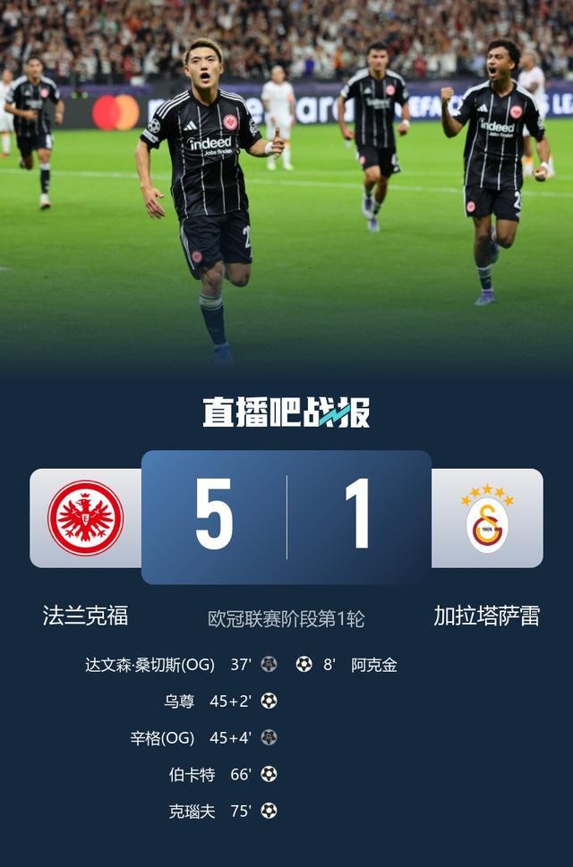 法兰克福5-1大胜土超豪门加拉塔萨雷,法兰克福方面四人贡献进球,此外辛格制造一粒乌龙。