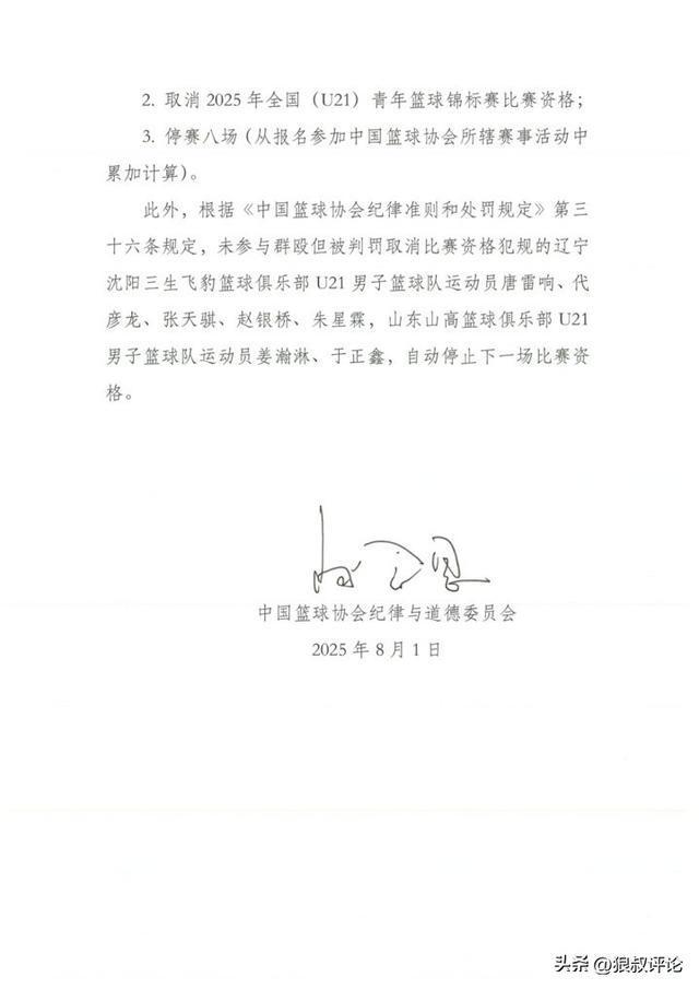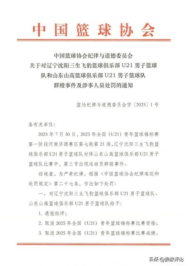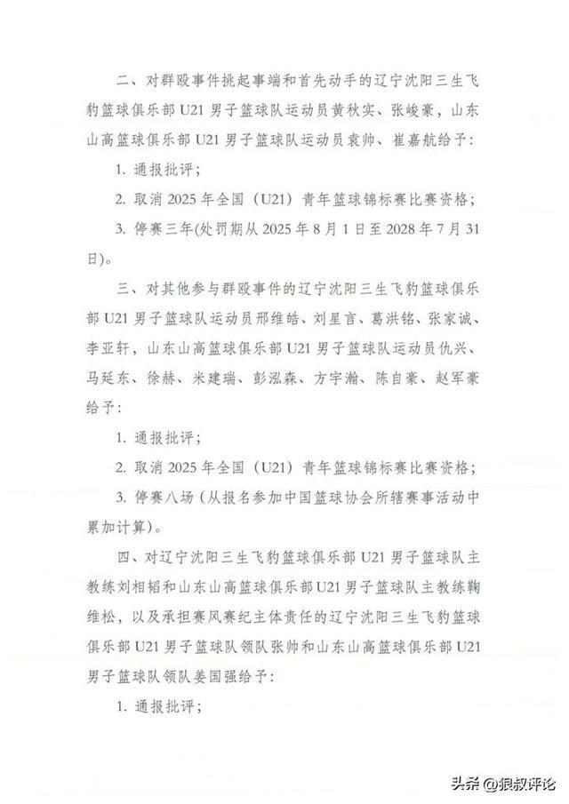 中国篮协开出重磅罚单,对该事件挑起事端和首先动手的黄秋实、张峻豪、袁帅、崔嘉航4名涉事球员给予停赛三年的处罚,对另外13名涉事球员给予 停赛八场的处罚。