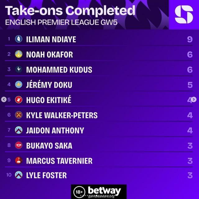 英超第5轮过人榜:恩迪亚耶9次最多,奥卡福、库杜斯各6次第二
