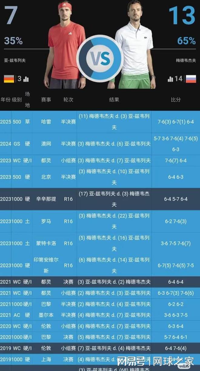 2023年,是梅总最近一次夺得巡回赛冠军的年份。那一年,他在三项大师赛相同的轮次都击败了兹维列夫,尤其值得一提的是,期间还有两次发生在红土场上。待到辛辛那提大师赛上,兹维列夫终于扳回一城。