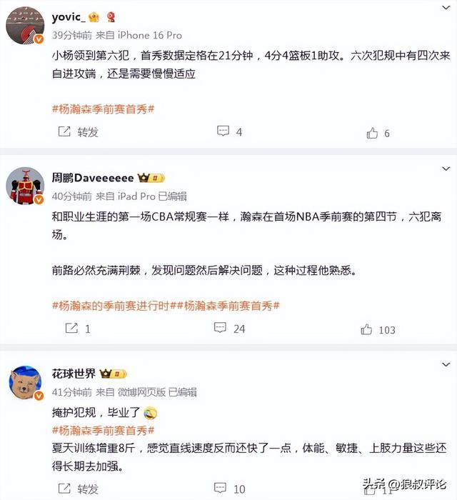 篮球评论员殳海发文点评:事非经过不知难。慢慢来吧小杨,欢迎来到NBA。