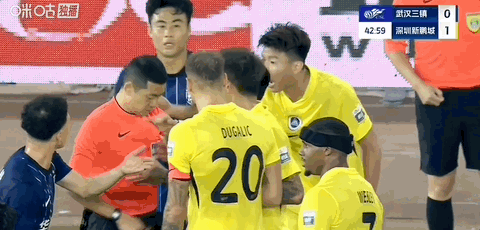 第43分钟,杨一鸣肘击沈子贵,张雷出示红牌将其罚下,新鹏城10人应战。深圳新鹏城众将投诉无果,这一判罚引发球迷不满。