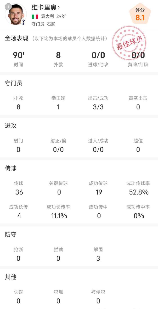 本场比赛热刺门将维卡里奥出场90分钟,虽然未能帮助球队避免败局,但他做出了多达8次的扑救。