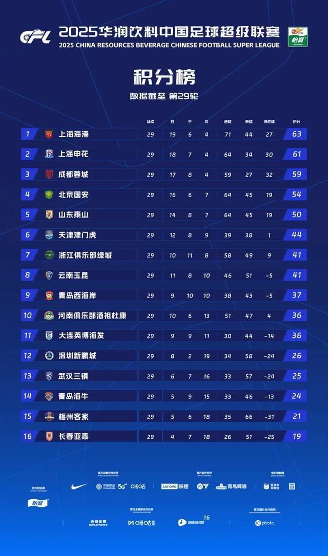至于保级形势,青岛海牛领先梅州客家3分,但相互战绩处于劣势,所以最后一个降级名额需要最后一轮才能确定。赛程方面青岛海牛客场对阵浙江绿城,梅州客家客场对阵北京国安。争冠方面,成都蓉城已经退出了争冠,上海海港积分63分,上海申花积分61分,上海海港对阵上海申花拥有相互战绩的优势,所以上海海港只需要战平即可夺冠。赛程方面上海海港客场对阵大连英博海发,上海申花客场对阵天津津门虎。