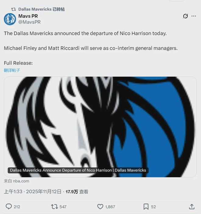 昨晚,NBA名记Shams终于发力,他透露小牛会在北京时间深夜12点开会,宣布解雇总经理哈里森,由球队功勋迈克尔·芬利暂时管理球队。