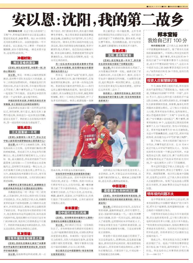 特约撰稿/沈君在辽宁铁人的前场“三叉戟”中,科特迪瓦裔的中国台北球员安以恩是边路主要进攻发起者,2025赛季,他以10次助攻名列助攻榜第五位。谈到加盟球队一年半的感受,安以恩说:“从上赛季一开始的步履蹒跚,到如今强势冲超,一路走来很不容易,这是团队的胜利。”