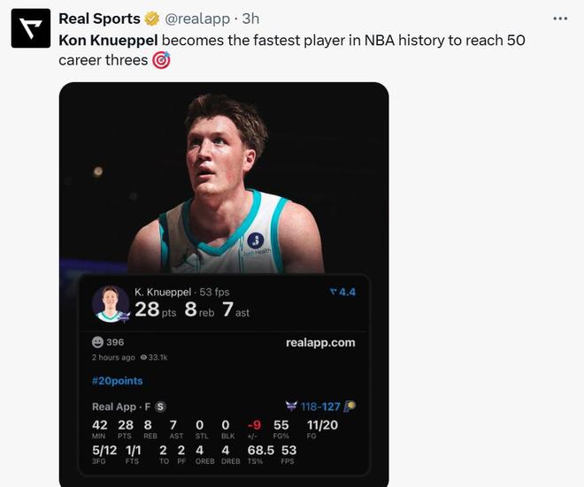 凭借这样的表现,克努佩尔生涯前15场比赛已经命中50记三分,成为NBA历史上达成这一表现最快的球员。