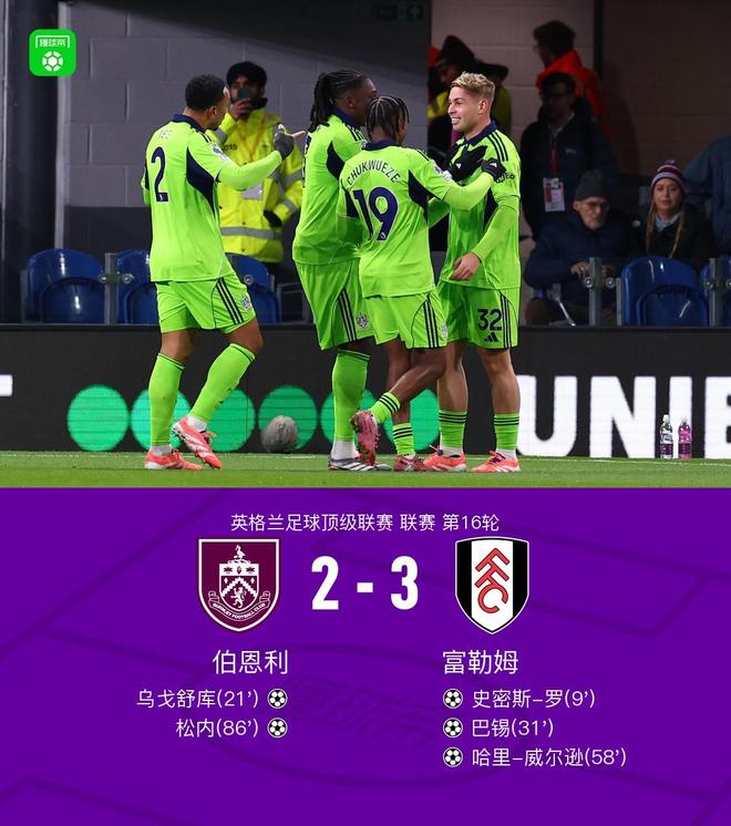 富勒姆客场32伯恩利,哈里威尔逊两传一射,史密斯罗建功