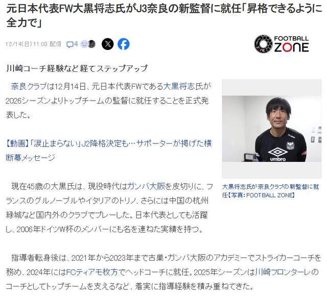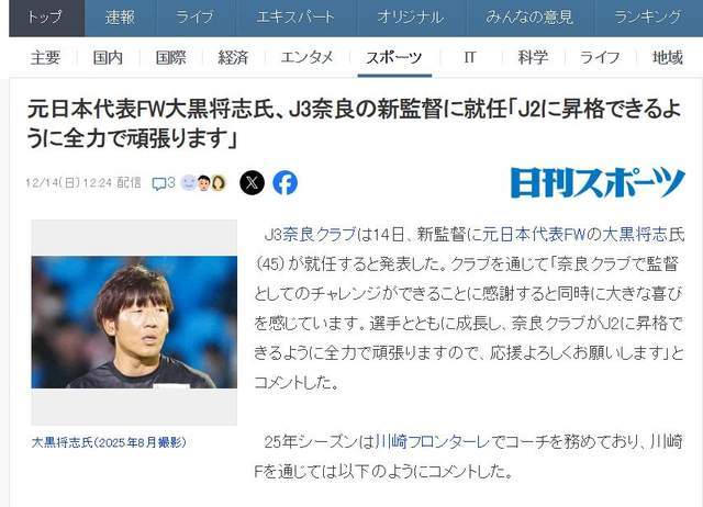 日本媒体最近也是多方报道了大黑将志成为奈良队主教练的消息,而且都不约而同地提到了他曾在中国踢球的标签,所以他这次上任,对于正在全力推动年轻球员留洋的中国足球来说,确实是一个重大利好了!(老邱)