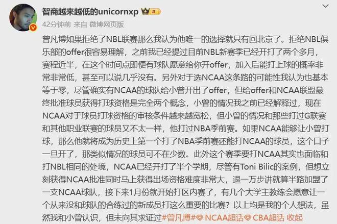 曾凡博正式放弃加盟澳洲NBL球队的机会,目前给他留的去向只有回归CBA,要么前往NCAA。