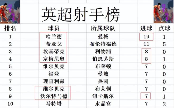 射手榜方面,哈兰德今天打入2球,在射手榜上是一骑绝尘而去,19球高居榜首,领先第2的蒂亚戈8球。埃基蒂克,塞梅尼奥齐破门,8球并列第3。沃尔特马德梅开二度,追上福登,理查利森等人,将前十门槛提高到7球。