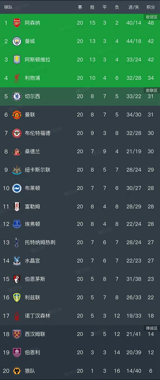 英超第20轮结束了所有比赛,最新积分榜如下!